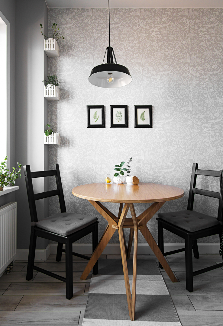 Кухня небольшая, проектировалась с учетом того, чтобы была рабочая поверхность для раскатки пиццы. Очень это hyggelig, я считаю ☺ Обои с паттерном от Borastapeter. Флора и лица – классика.