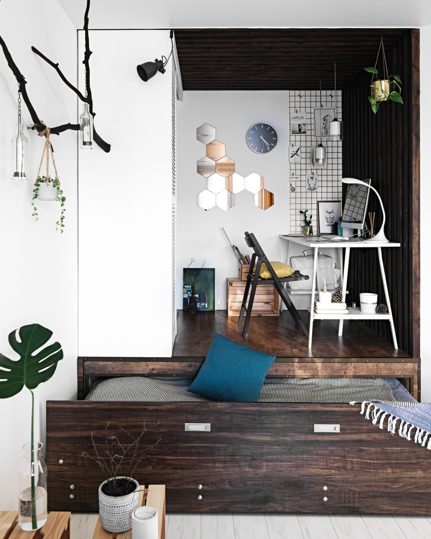 A rug is being knit, plants grows in handmade concrete pots. A decorative ladder, a table, a shelve unit and a branch were made by Marina and Ivan. Even the pedestal for the bed was drawn by Marina herself, as her profession of a design engineer gave her all the necessary skills. A wardrobe on the pedestal is Ivan’s own project where IKEA filling only was used.
